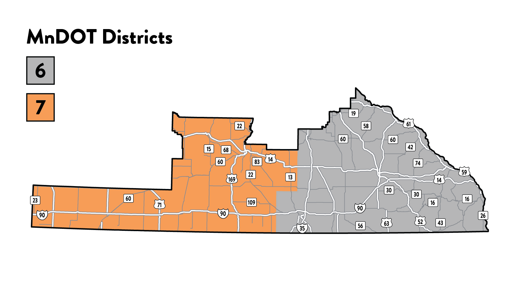 Within the statewide effort, there are eight TZD regions that align with the eight MnDOT districts. Congressional District 1 is covered by the South Central and Southeast TZD regions. Our goal is to use regional crash data to identify factors leading to fatal and serious injury crashes and work with constituents to implement proven countermeasures.
