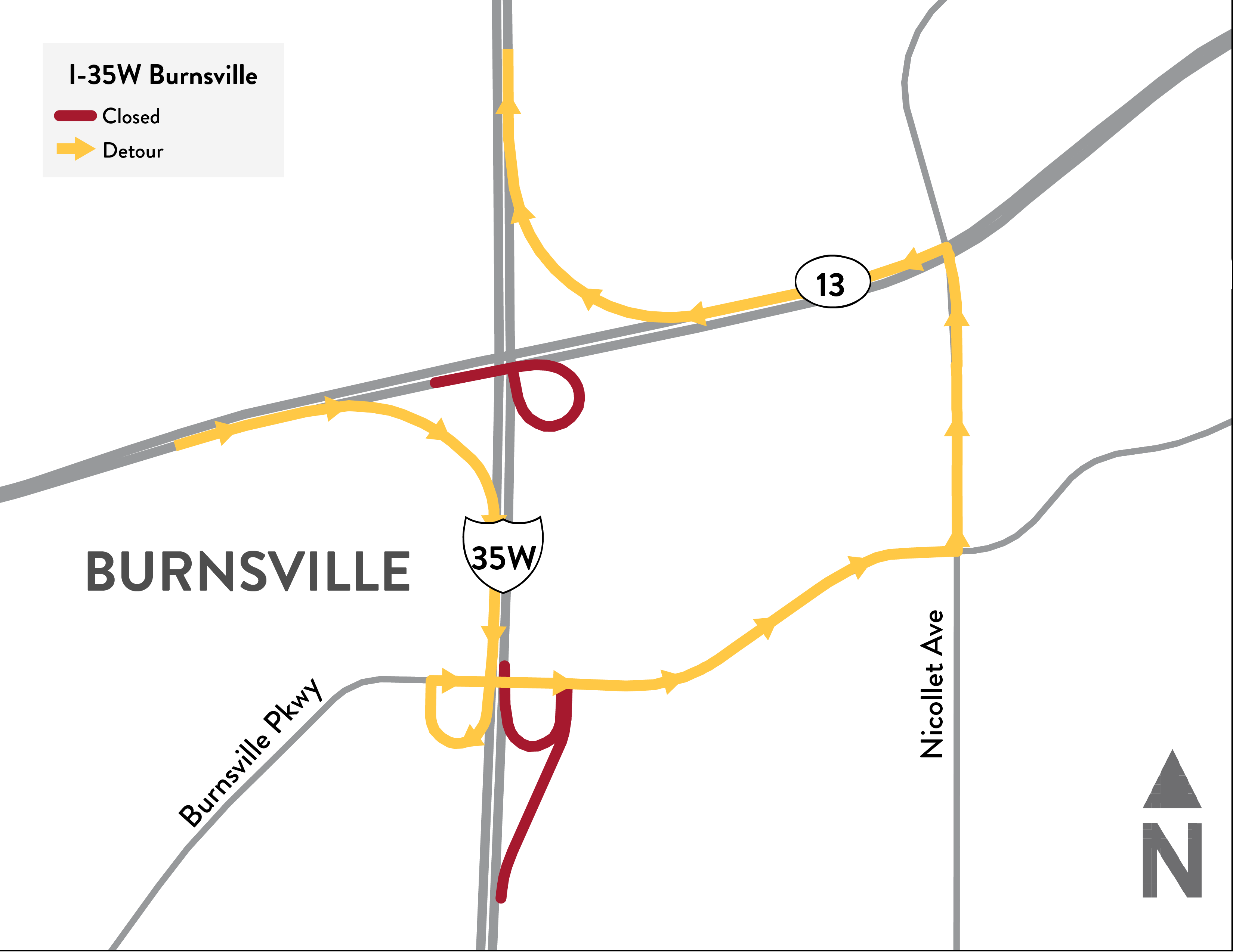 - Detour: Burnsville Pkwy. to northbound Nicollet Ave. to westbound Hwy 13 to northbound I-35W