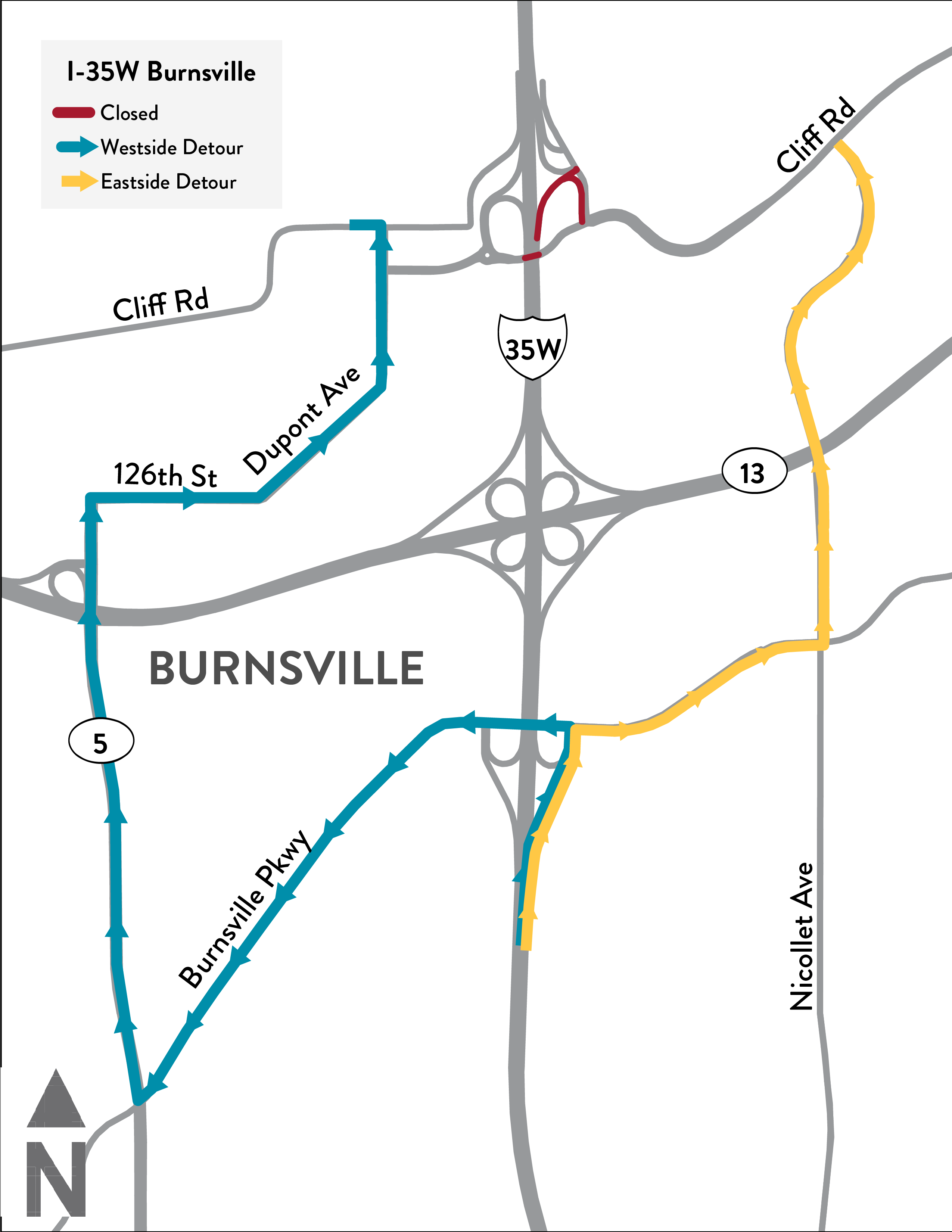 - Detour (eastside of I-35W): Northbound I-35W to Burnsville Pkwy. to Nicollet Ave. to Cliff Rd. (PNG)