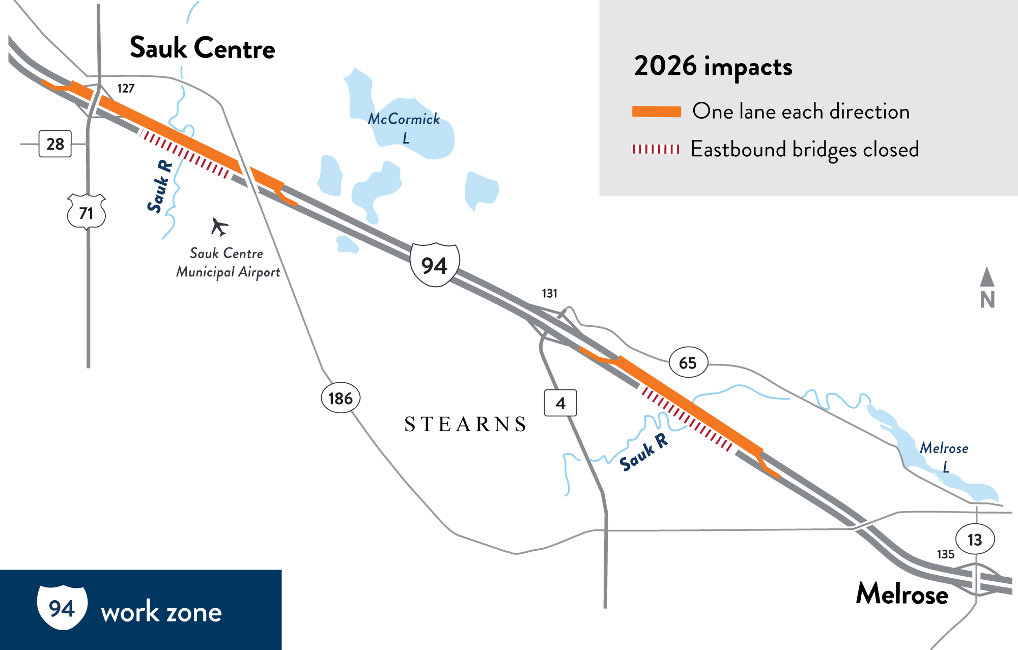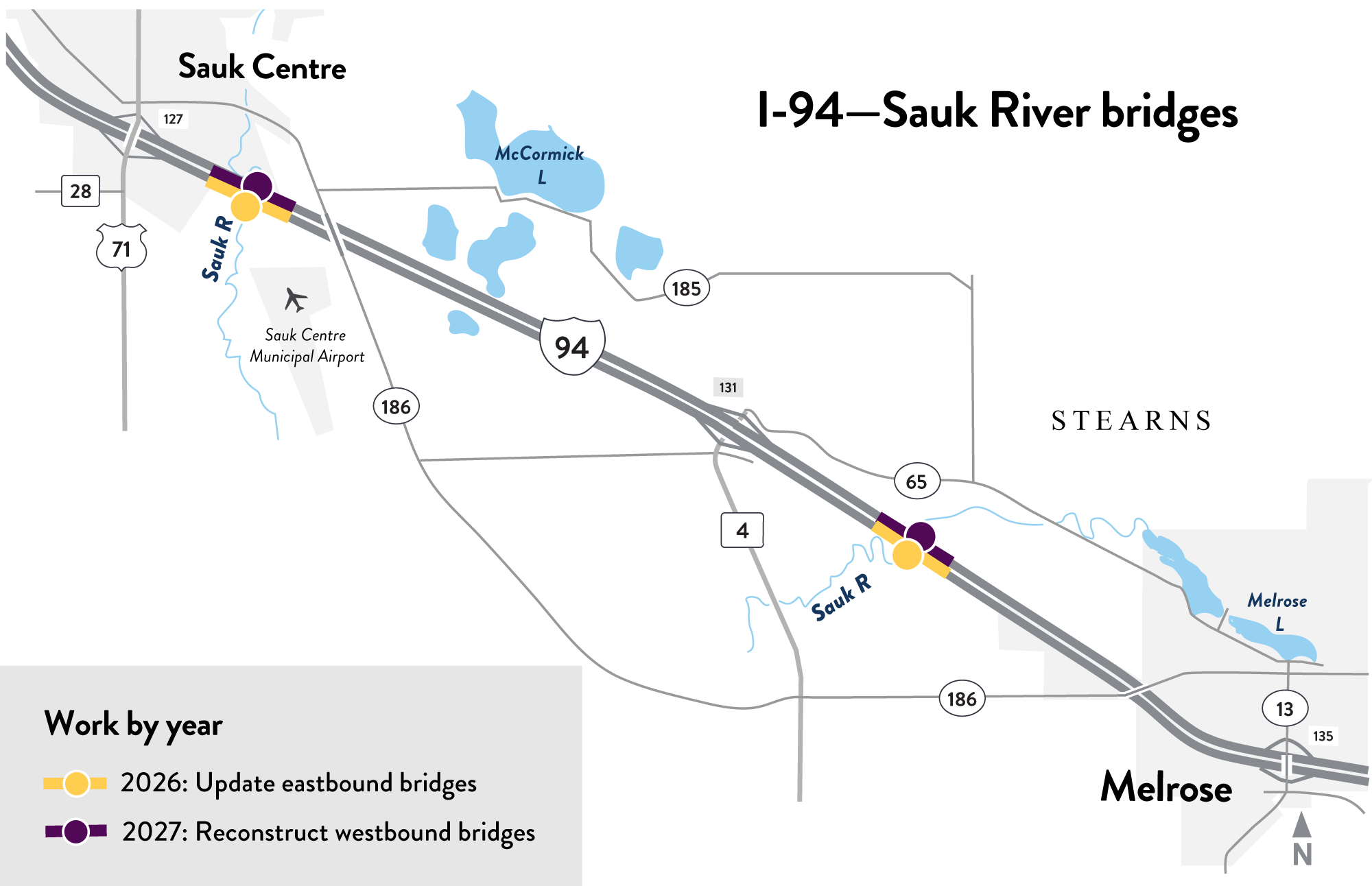 MnDOT will improve four bridges on Interstate 94 over the Sauk River between Sauk Centre and Melrose in Stearns County. The two-year project begins in 2026 with repairs to the eastbound bridges, followed by full reconstruction of the westbound bridges in 2027.