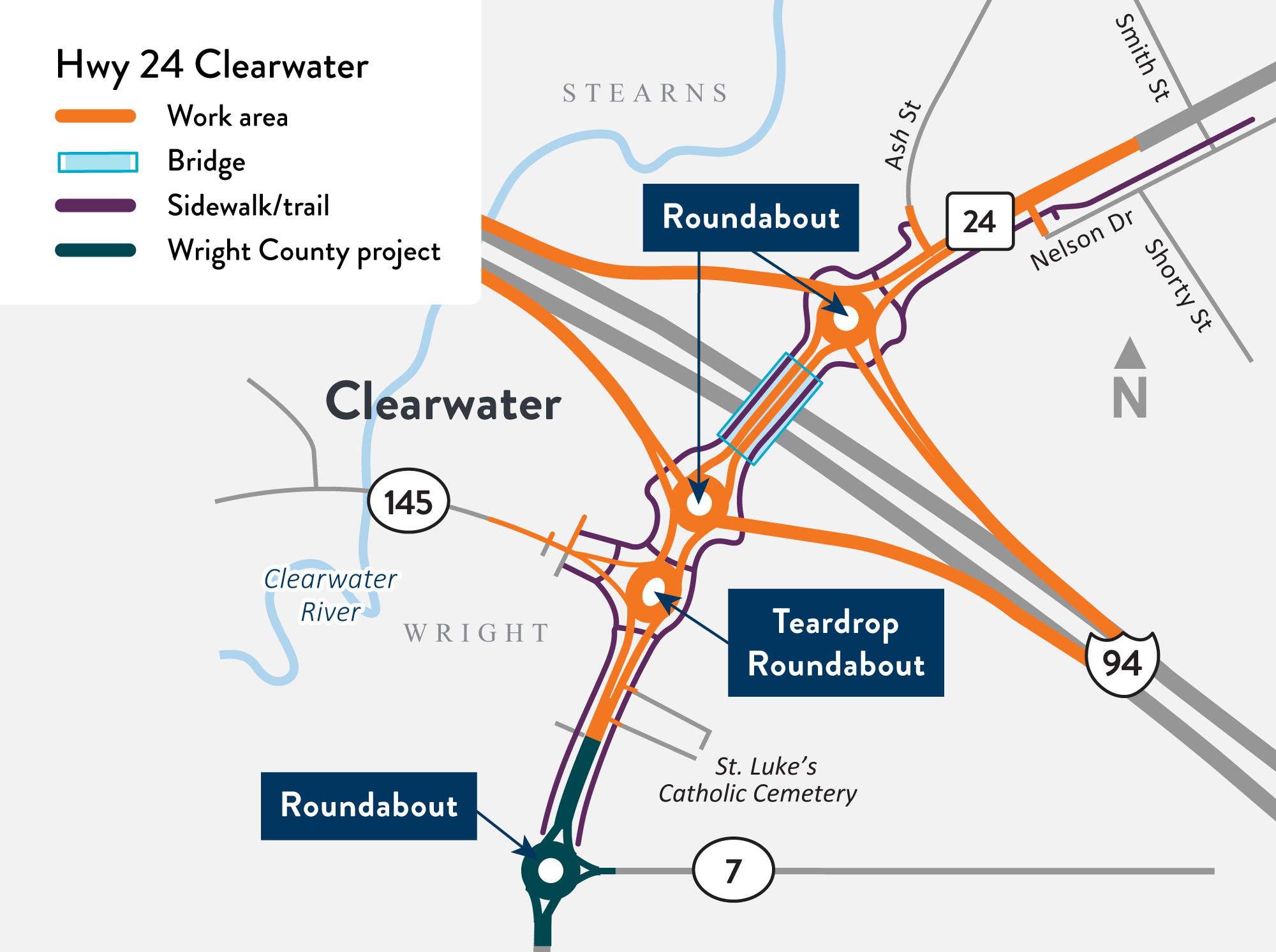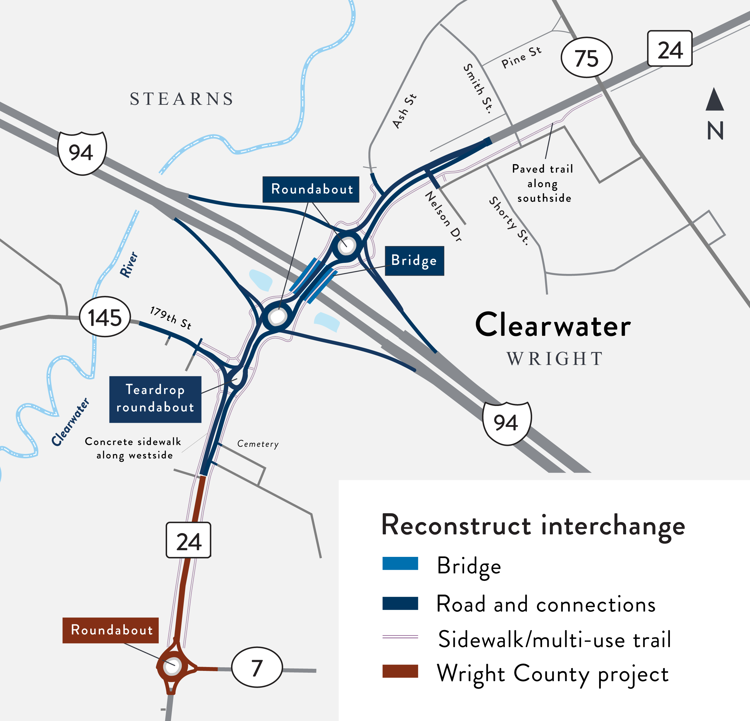 MnDOT will reconstruct and improve the Hwy 24 interchange at I-94 in Clearwater, Wright County. This includes roundabouts and a new bridge in 2026-2027. Hwy 24 will remain open to traffic at most times, with the exception of some overnight closures for bridge work.