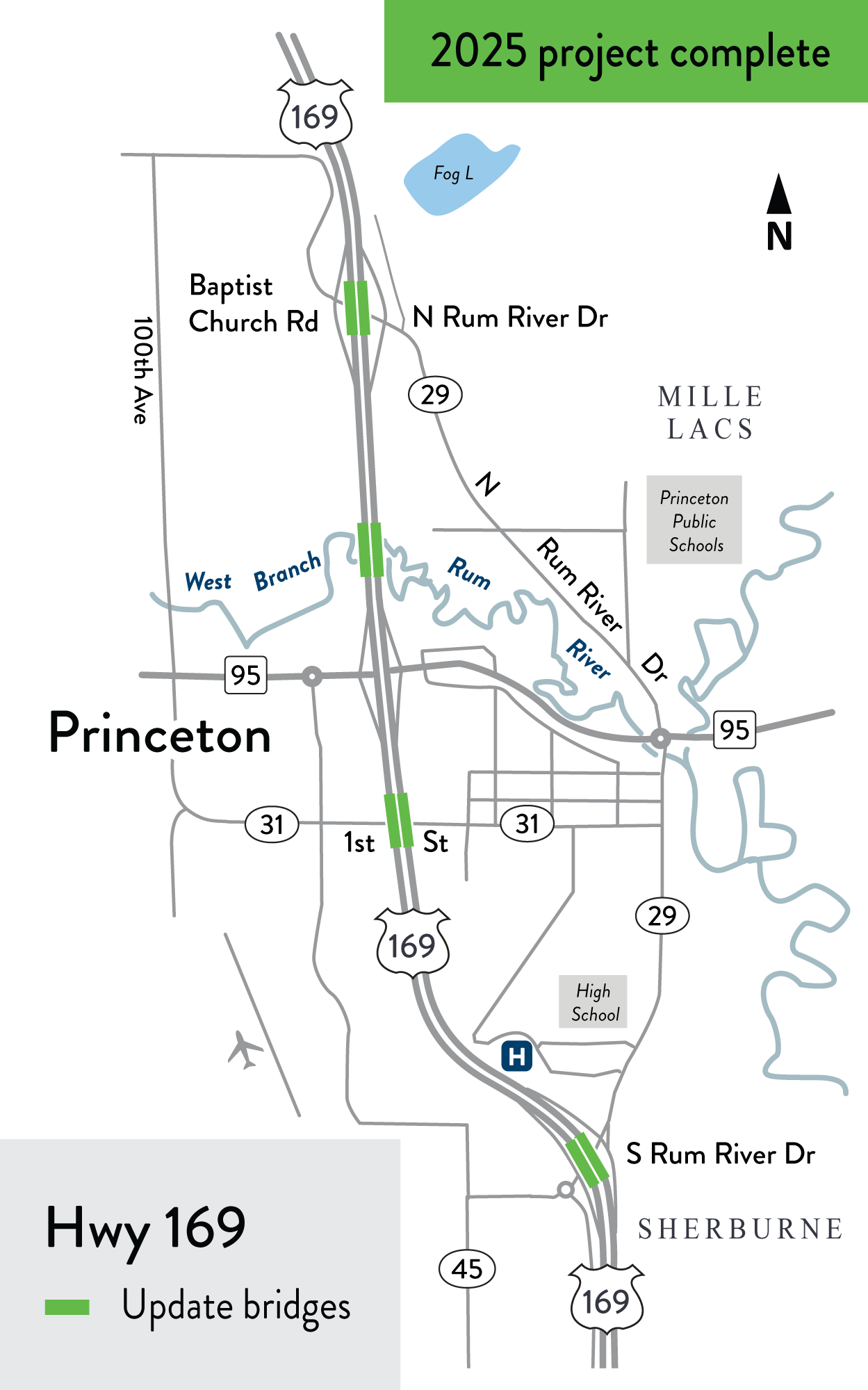 MnDOT updated and improved eight Hwy 169 bridges (four each direction) through Princeton. Minor lane or shoulder closures may continue into early November as crews complete final tasks.