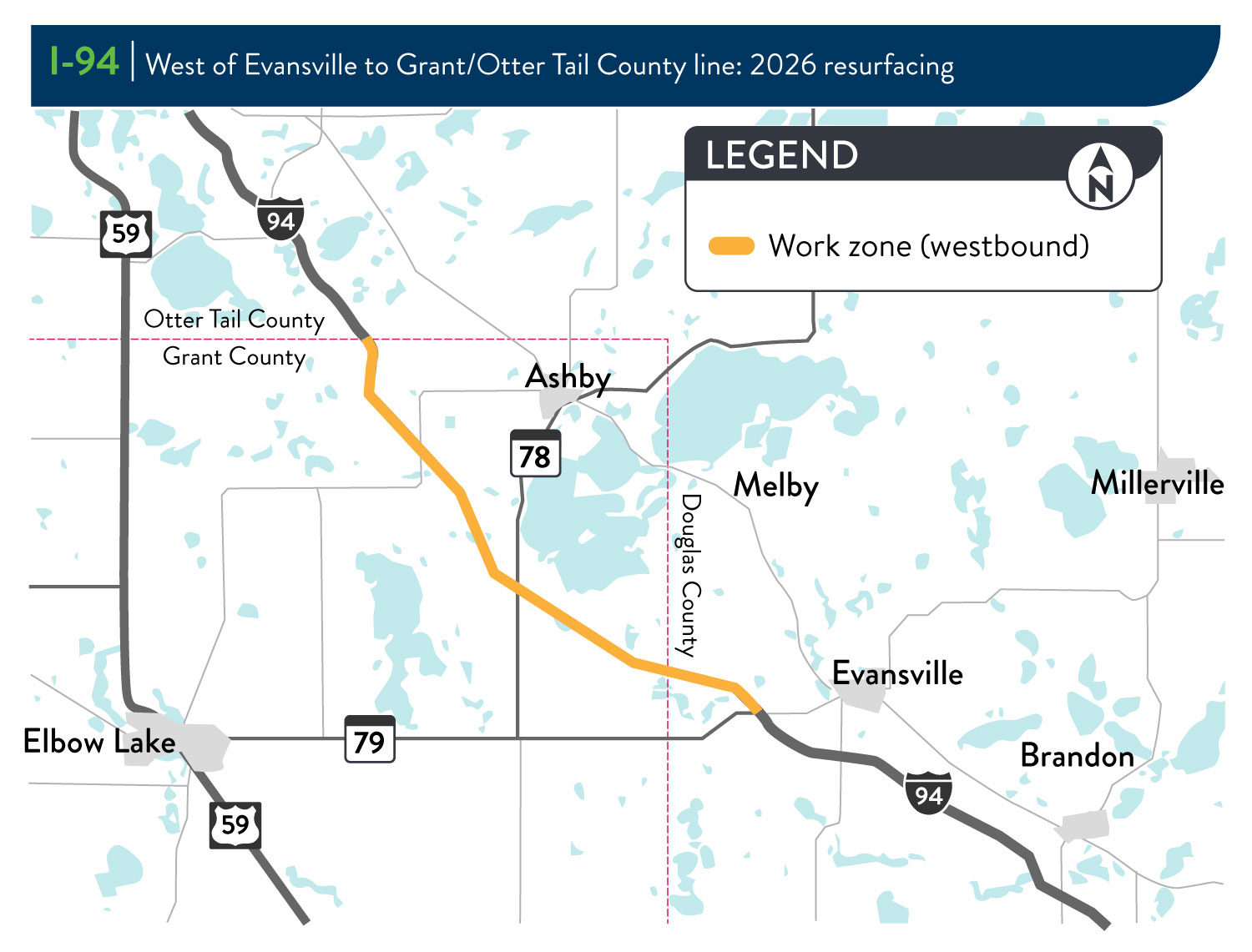 In 2026, the Minnesota Department of Transportation will resurface the westbound lanes on Interstate 94 from Highway 79 near Evansville to the Grant/Otter Tail county line (approximately near the County Road 26 overpass).