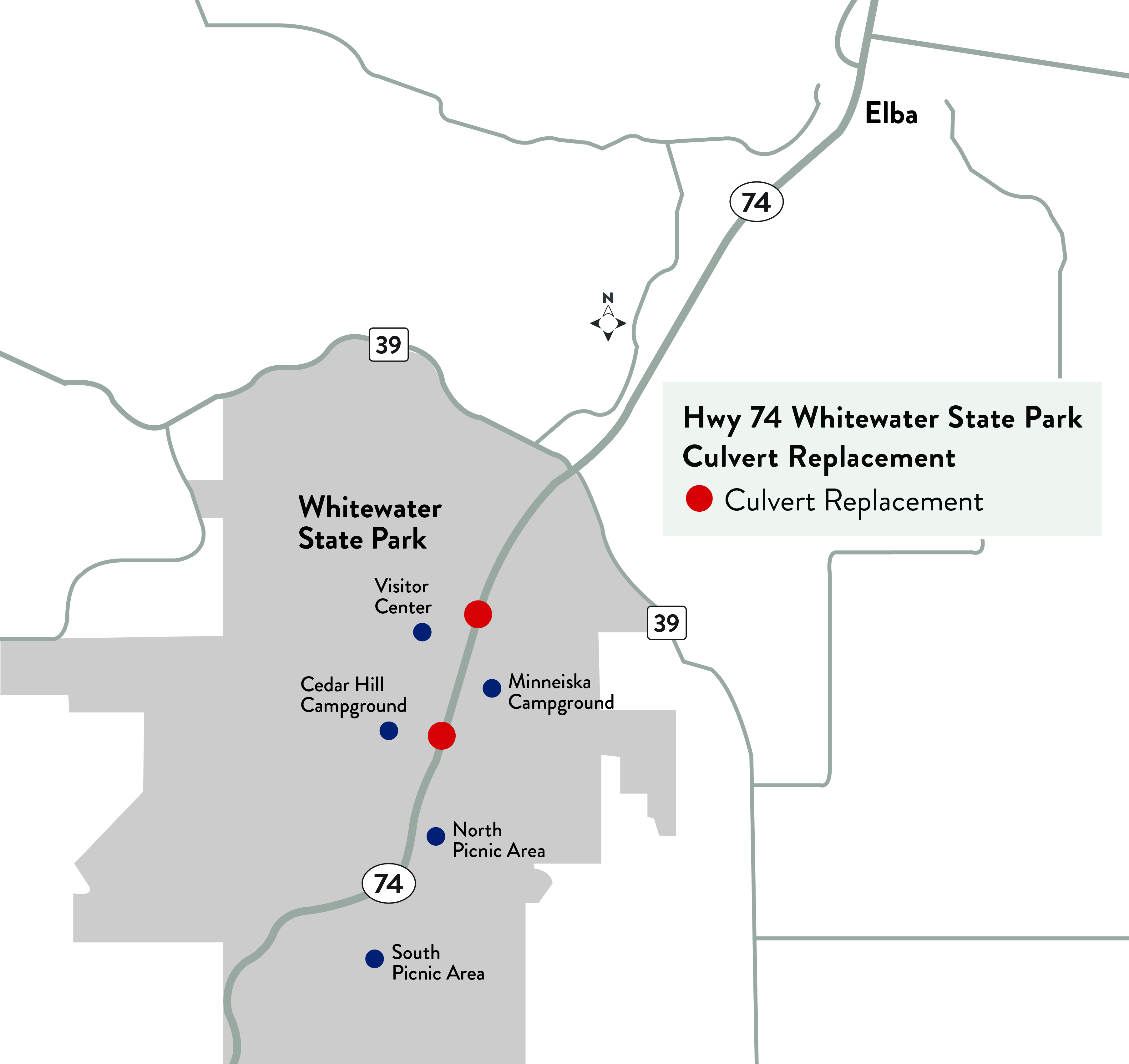 North culvert: The detour route into the park when the north culvert is being replaced will be Winona Co Rd 39 /Olmsted Co Rd 2 west to Olmsted County Road 10 south to Olmsted Co Rd 9/Winona Co Rd 22 east to Hwy 74 north. Travelers from the south on Hwy 74 will be able to reach most of the park but not travel through to Elba.