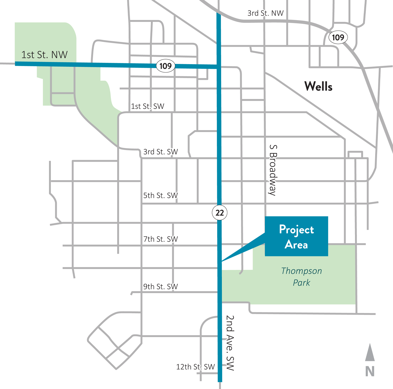 Hwy 22 in Wells from the northern intersection with Hwy 109 to just south of 12th St. SW, as well as Hwy 109 from west of Rose Hill Cemetery to Hwy 22, will be reconstructed to improve the pavement, utilities, and bicycle/pedestrian accommodations.
