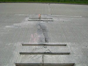 Partial repairs showing the top half chipped or ground out. This also shows a spot where the deterioration of the old concrete goes to the base. Rebar is drilled and epoxied into the old concrete to help keep the new concrete in place.