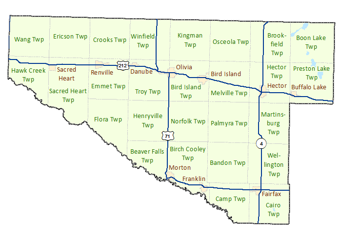 Renville County image map with links to city and township maps Wang Township Ericson Township Crooks Township Winfield Township Kingman Township Osceola Township Brookfield Township Boon Lake Township Hawk Creek Township Flora Township Henryville Township Beaver Falls Township Norfolk Township Palmyra Township Bandon Township Camp Township Wellington Township Martinsburg Township Morton Franklin Fairfax Sacred Heart Renville Danube Olivia Bird Island Buffalo Lake Hector Sacred Heart Township Cairo Township Preston Lake Township Hector Township Birch Cooley Township Birch Cooley Township Melville Township Bird Island Township Troy Township Troy Township Emmet Township