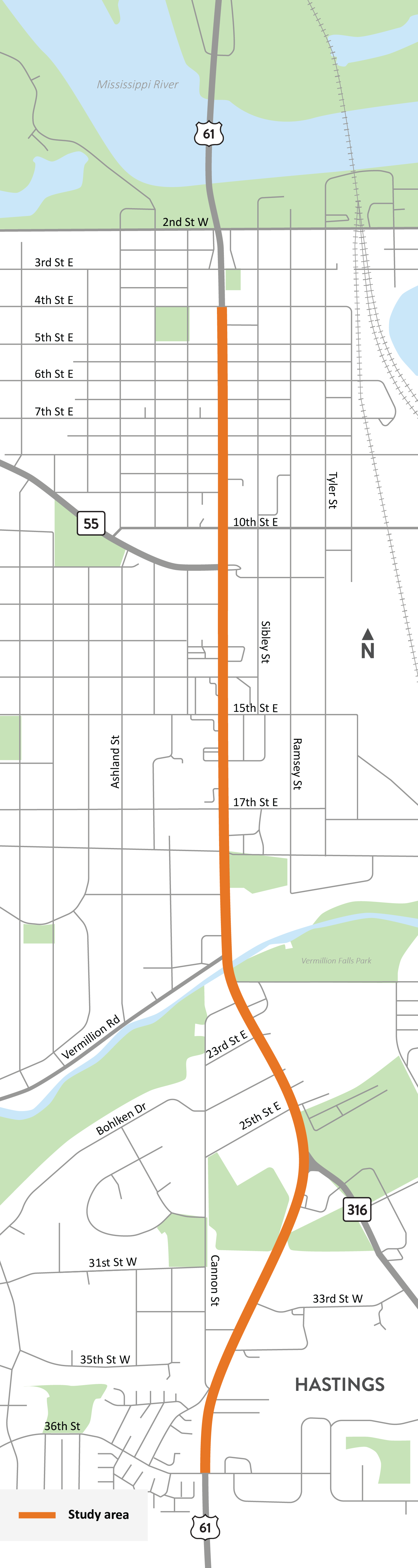 The upcoming work is a result of the study of Hwy 61 in Hastings between 4th St. and 36th St. That study identified safety improvements for all modes of travel, alternatives for primary intersections, and options to consolidate private driveways and public roads.