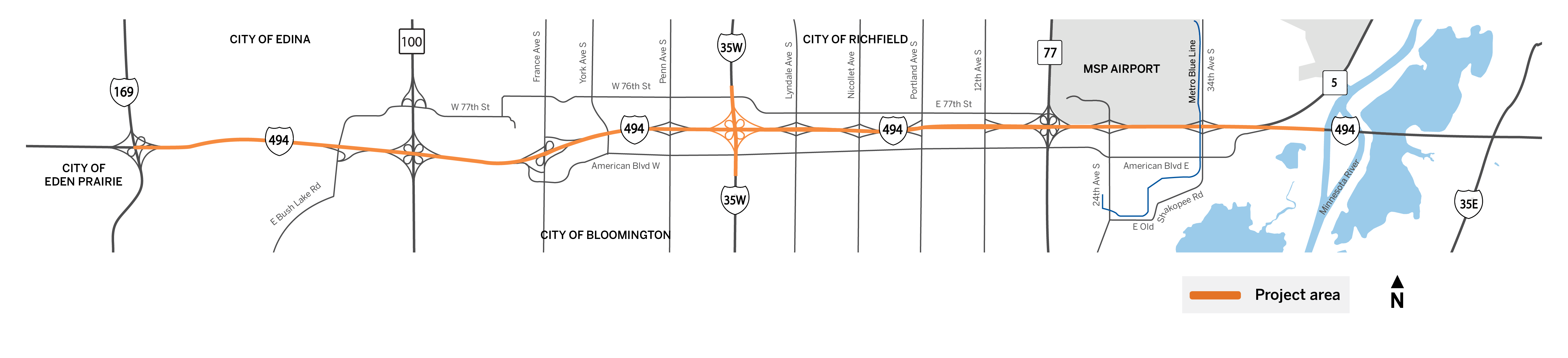 The first construction project that is part of the I-494: Airport to Hwy 169 vision began in spring 2023. Work will be done on I-494 between East Bush Lake Rd. in Edina and 12th Ave. North in Richfield through fall 2026. The second construction project is set to begin in 2027. This project will expand E-ZPass lanes from I-35W to Hwy 77, reconstruct ramps and bridges at key interchanges, and include upgrades to pavement, drainage, and pedestrian infrastructure.
