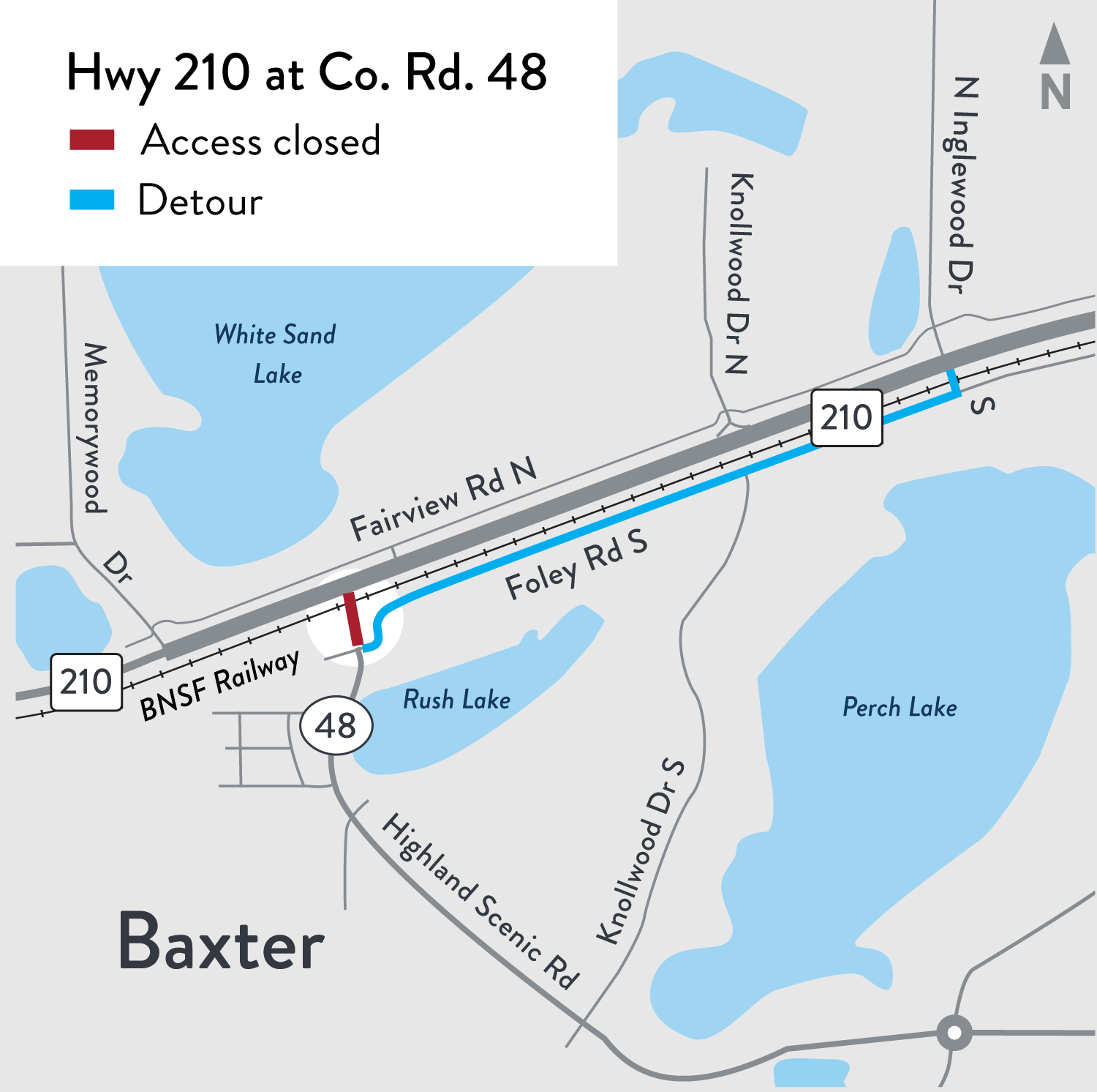 - Highland Scenic Drive (County Road 48) will close to all traffic between Highway 210 and Foley Road/Marohn Road S for approximately 14 working days. Follow detour signs along Inglewood Drive S and Foley Road. A detour map is available on the Highway 210 Baxter project web page.