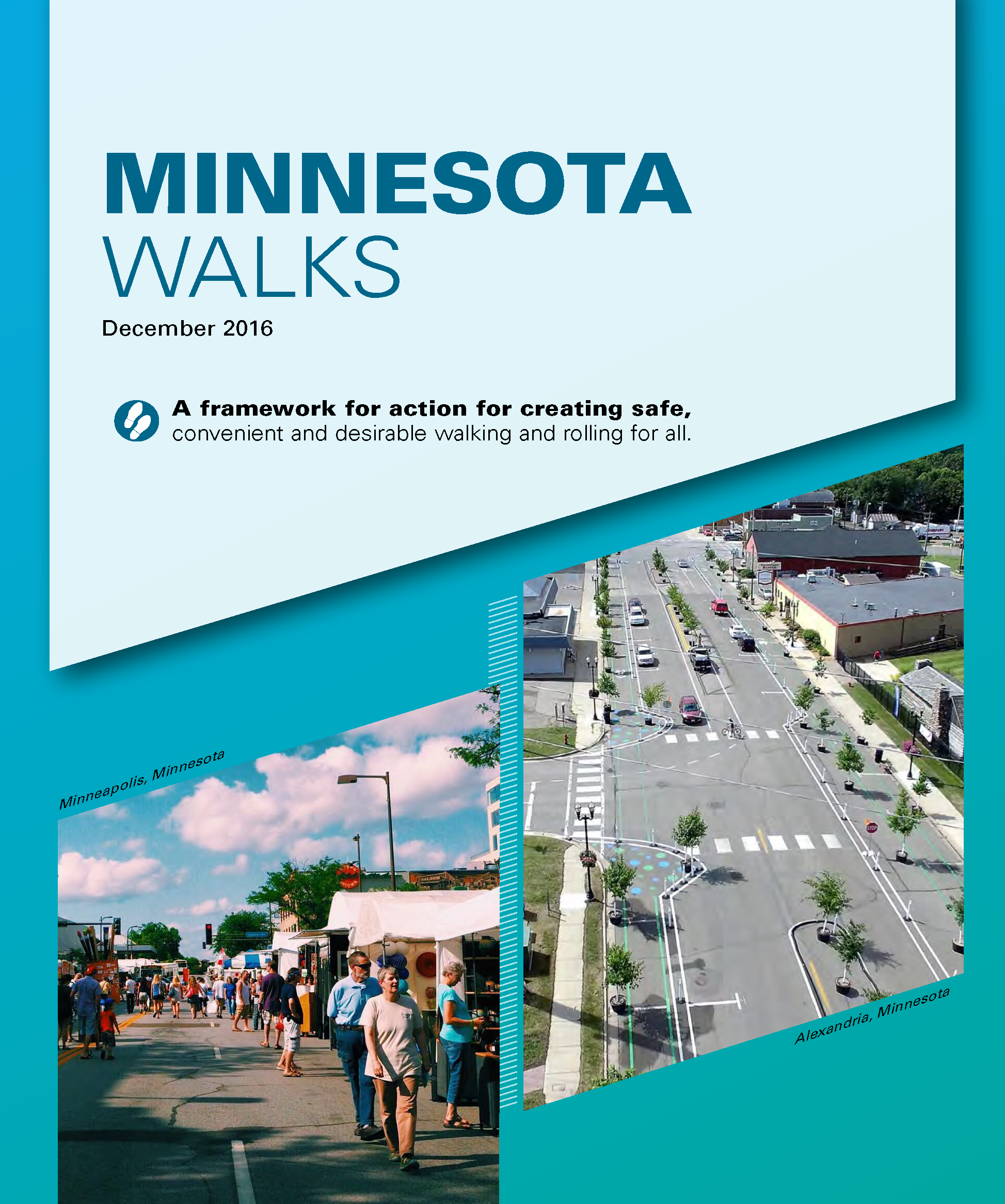 Minnesota Walks (PDF) is a collaborative effort between MnDOT and the Minnesota Department of Health (MDH) which provides a shared vision for how all Minnesotans can have safe, desirable and convenient places to walk where they live, work, learn and play.