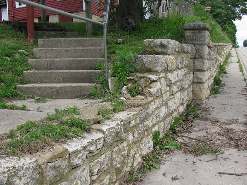 The same wall after restoration in 2011, featuring its stone masonry and steel rail restored to the original color. (Click to enlarge.)