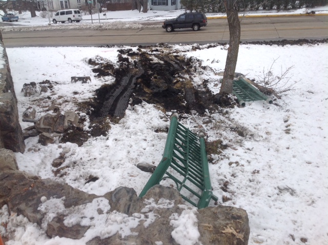 The wall after sustaining a second commercial vehicle accident in March, 2014. An insurance assessment to cover repairs is pending. (Click to enlarge.)