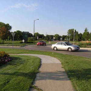 Pavement markings, curves at entry points, and raised islands direct traffic into a one-way counter-clockwise flow around the central island.