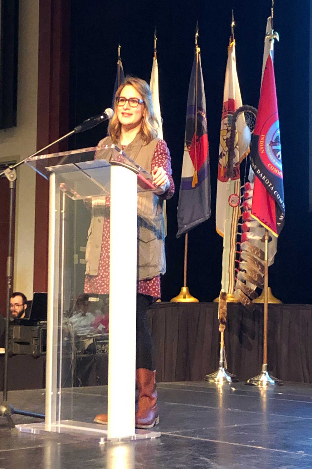 White Earth Nation Honor Guard presents the colors of the 11 tribal nations in Minnesota, the State flag, and the United States flag during the opening ceremony.