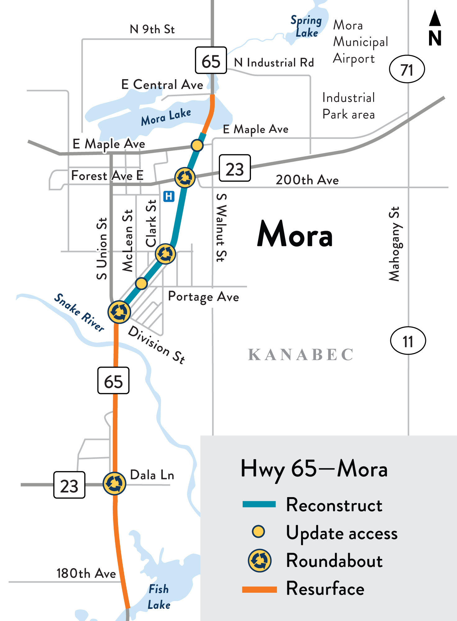 MnDOT is developing a project to reconstruct, improve access and update Hwy 65 through Mora in 2030-2031. The project includes new roundabouts and connections, city utilities and pedestrian sidewalk/trail.
