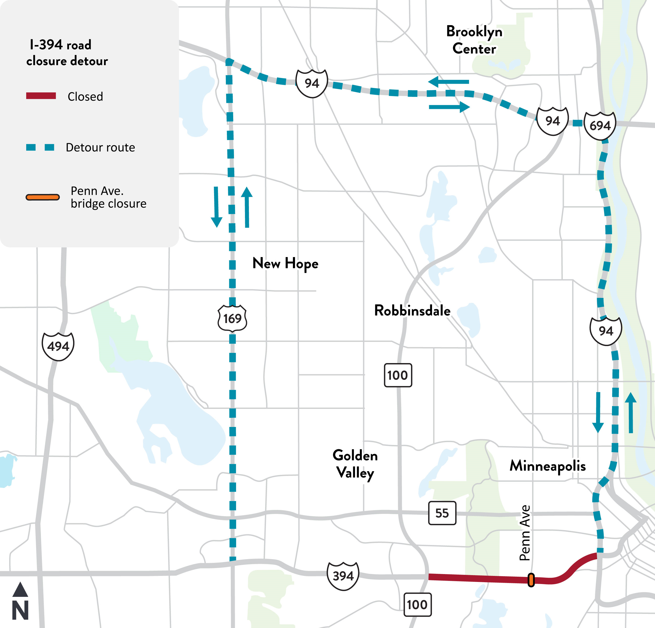 - I-394 is closed in both directions between downtown Minneapolis and Hwy 100