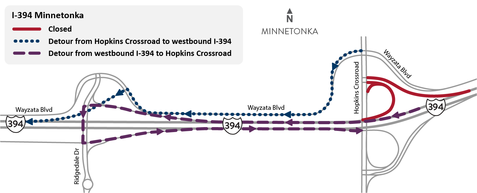 • Detour: Ridgedale Drive exit to eastbound I-394 to Hopkins Crossroad.