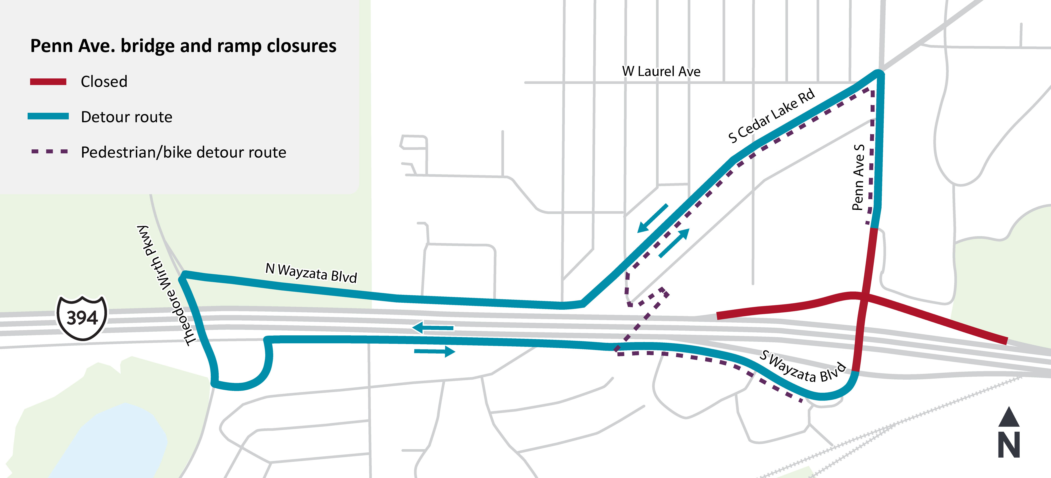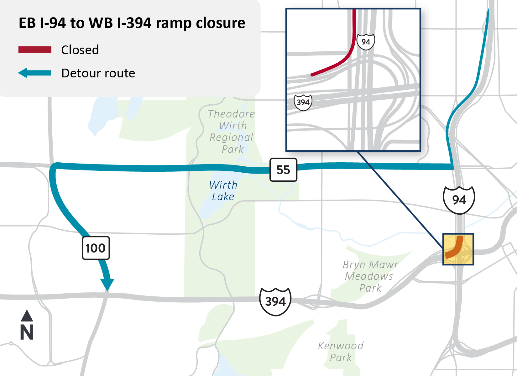 • Westbound I-394 is reduced to two lanes between downtown Minneapolis and Hwy 100